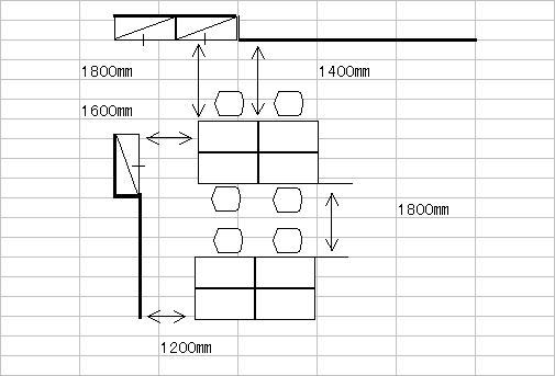 標準的なレイアウトの寸法は、人がすれ違える事及び車椅子の通過が楽に出来る事が基本になります。通路として、1.2mを確保することが、望ましいと言えます。